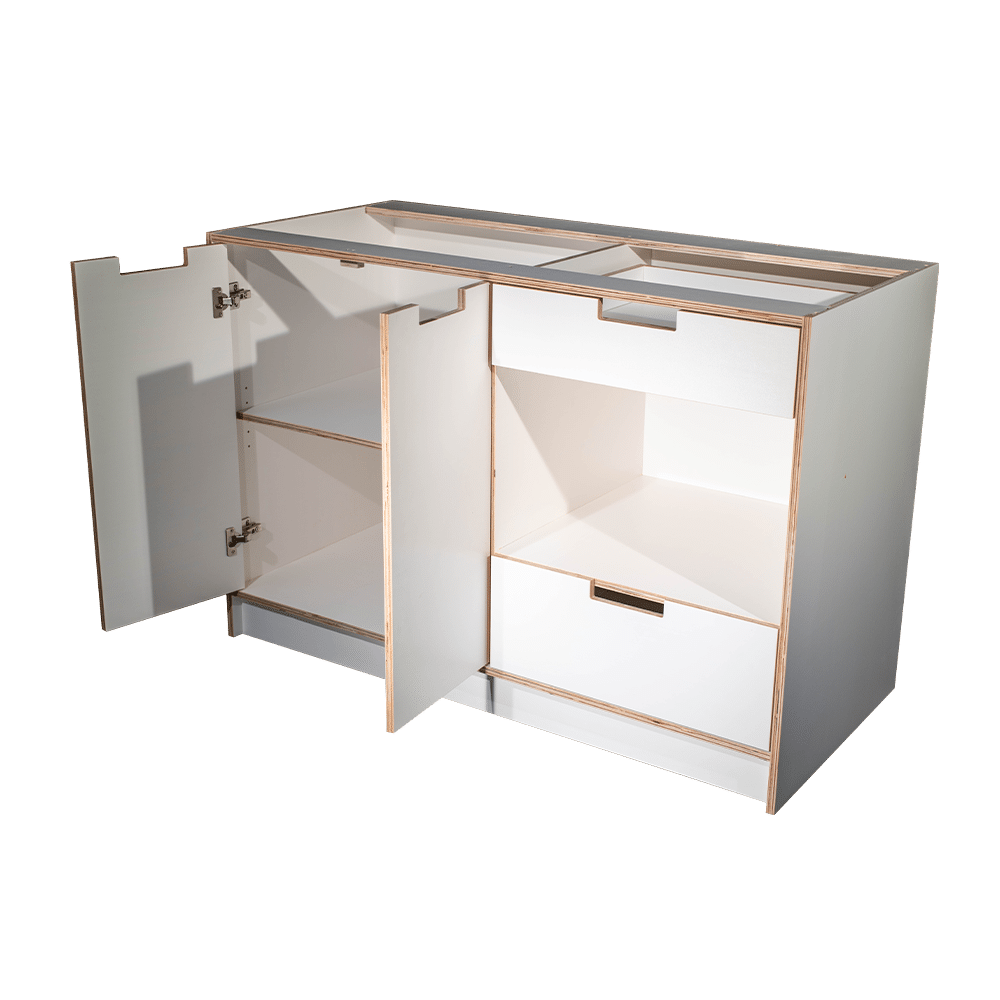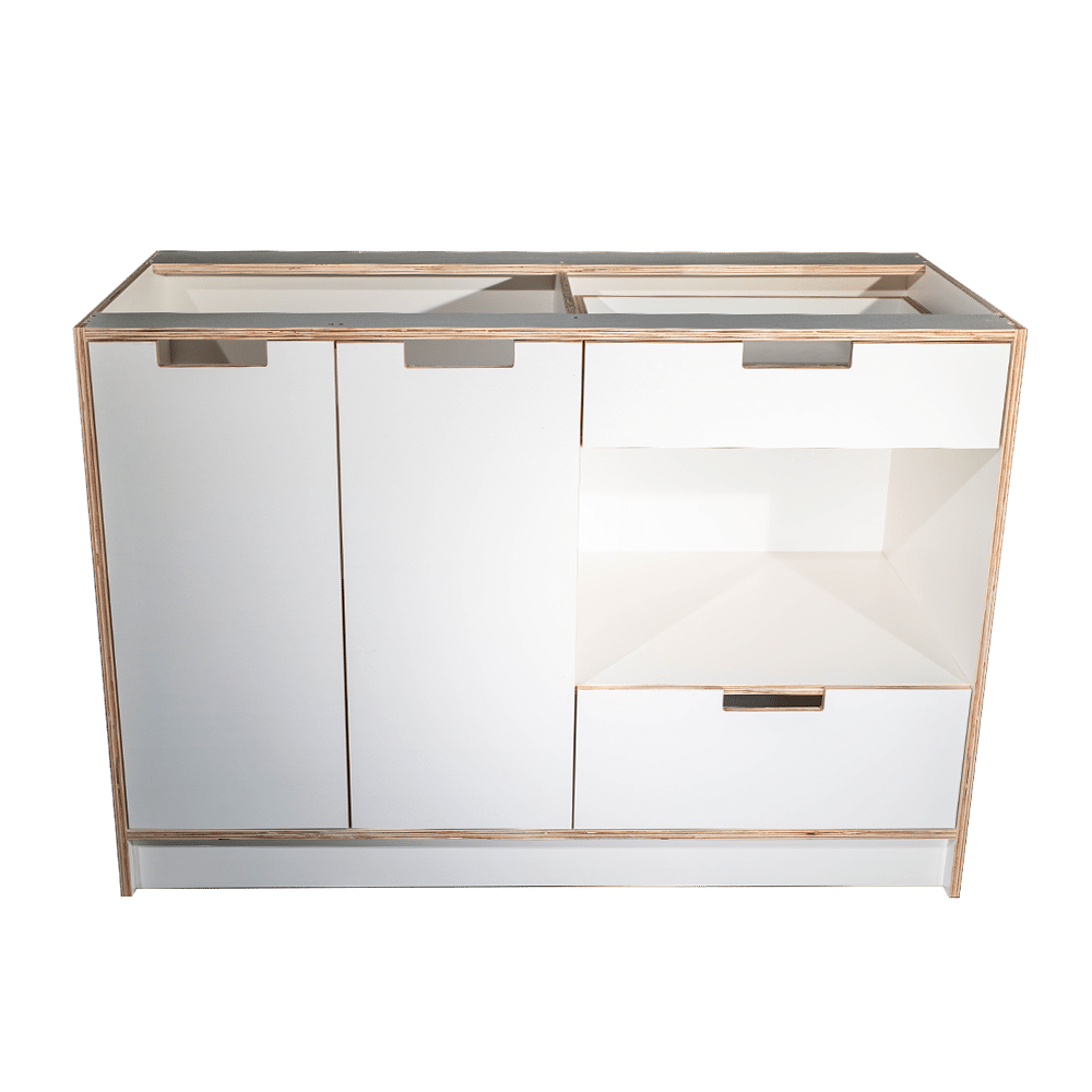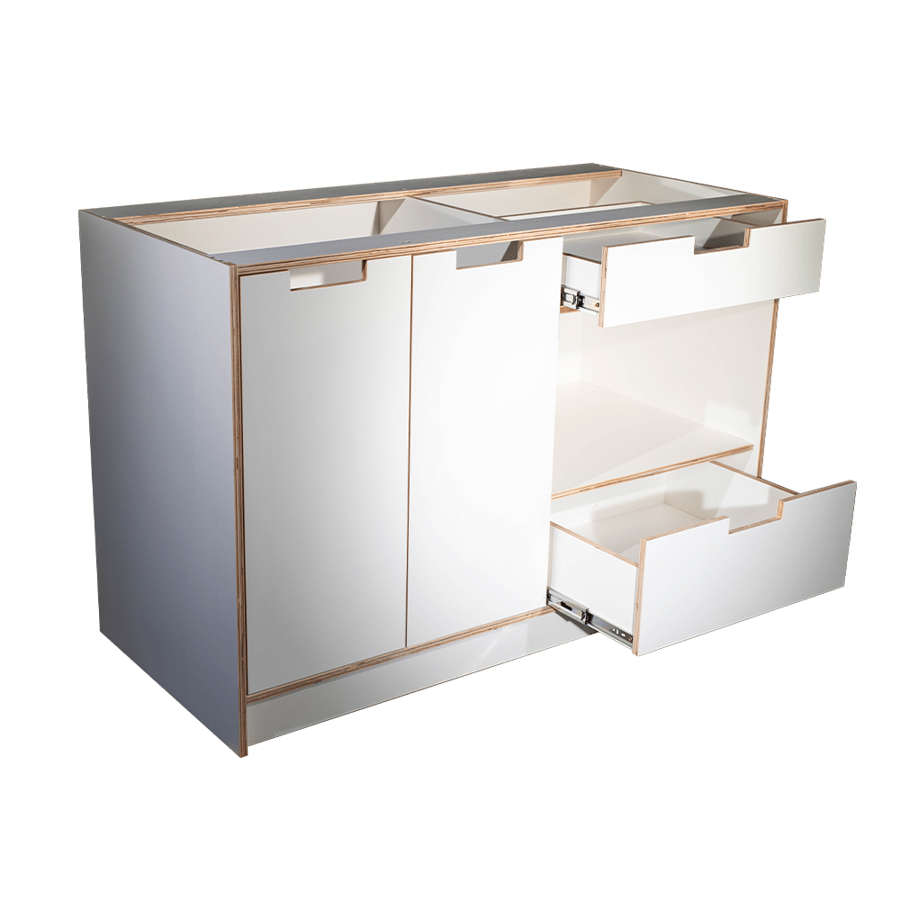 - Cabinets are made from plywood. This is a natural product that is healthier and cleaner for the environment and increases the strength and durability of the product compared to MDF products